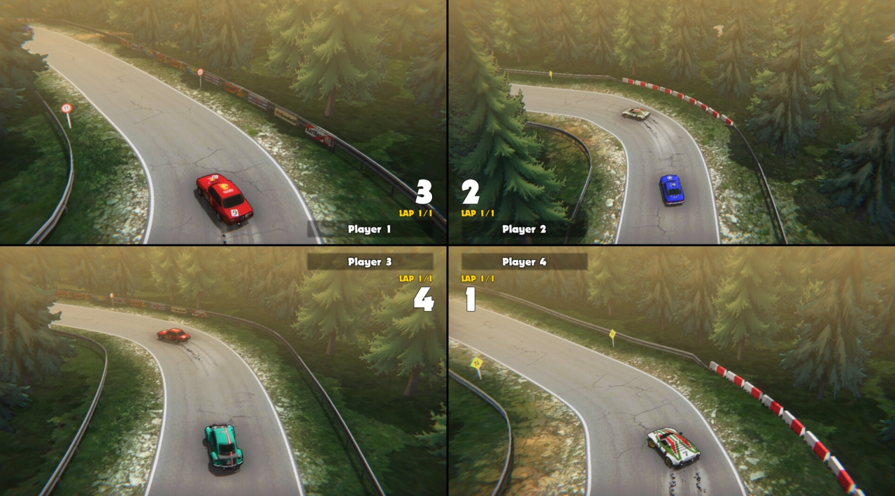 You can play singleplayer races, but you’re not locked into being alone. There’s local multiplayer in split-screen for up to 4 players. If you like rally games as a “hand the controller to a friend” experience, this is built for that. You can keep it casual, or you can get competitive fast. You know how it goes: one clean run, one laughably bad corner, and suddenly everyone wants a rematch.
